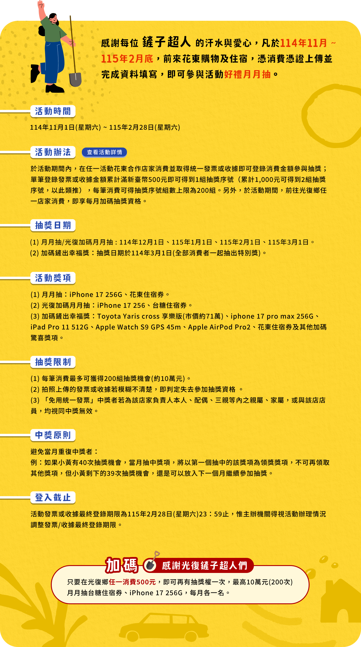 只要在光復鄉任一消費500元,即可再有抽獎權一次,最高10萬元(200次) 月月抽台糖住宿券、iPhone 17 256G,每月各一名。
