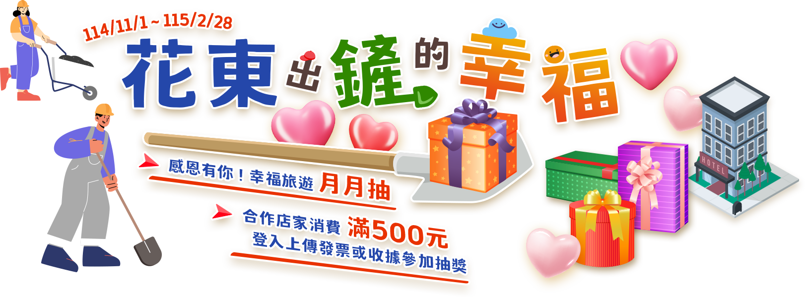 於活動期間內,在任一活動花東合作店家消費並取得統一發票或收據即可登錄消費金額參與抽獎;單筆登錄發票或收據金額累計滿新臺幣500元即可得到1組抽獎序號(累計1,000元可得到2組抽獎序號,以此類推),每筆消費可得抽獎序號組數上限為200組。另外,於活動期間,前往光復鄉任一店家消費,即享每月加碼抽獎資格。